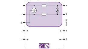 Space-saving combined lightning current and surge arrester module with RFID LifeCheck for protecting four single lines sharing a common reference potential as well as unbalanced interfaces. If LifeCheck detects thermal or electrical overload, the arrester has to be replaced. This status is indicated contactlessly by the DEHNrecord LC / SCM / MCM reader.