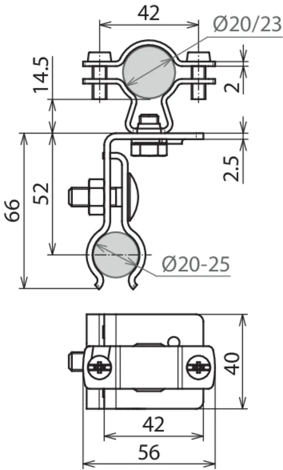 Roof conductor holder with slotted two-screw saddle clamp and Z-shaped connection lug