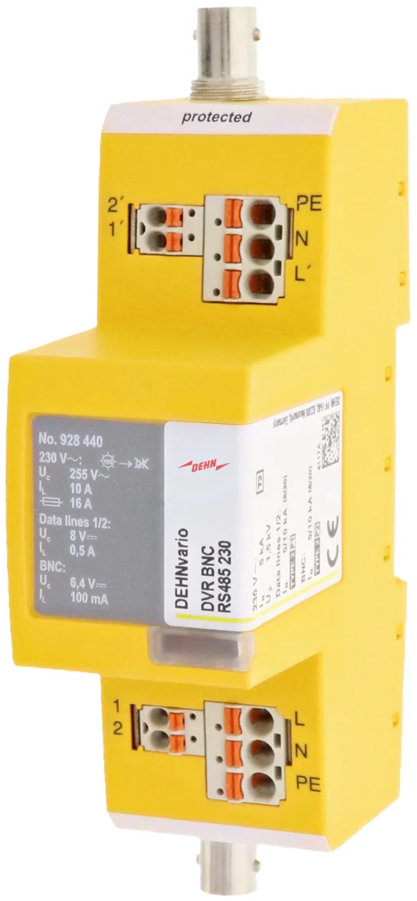 Compact 3-in-1 surge arrester for protecting analogue camera systems. Protection of the video signal (BNC connection), a data signal (RS485) and a voltage supply (230 V a.c.). Direct plug-in technology allows fast conductor connection without tools. Easy replacement of the arrester is ensured by the integrated terminal units which can be released and then removed from the enclosure. Integrated overload indication (230 V).