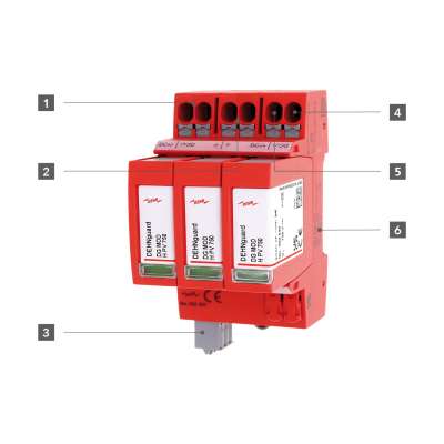 Mehrpoliger Überspannungsableiter Typ 2 nach EN 61643-31, bestehend aus Basisteil mit gesteckten Schutzmodulen und Push-in-Anschlussklemme.