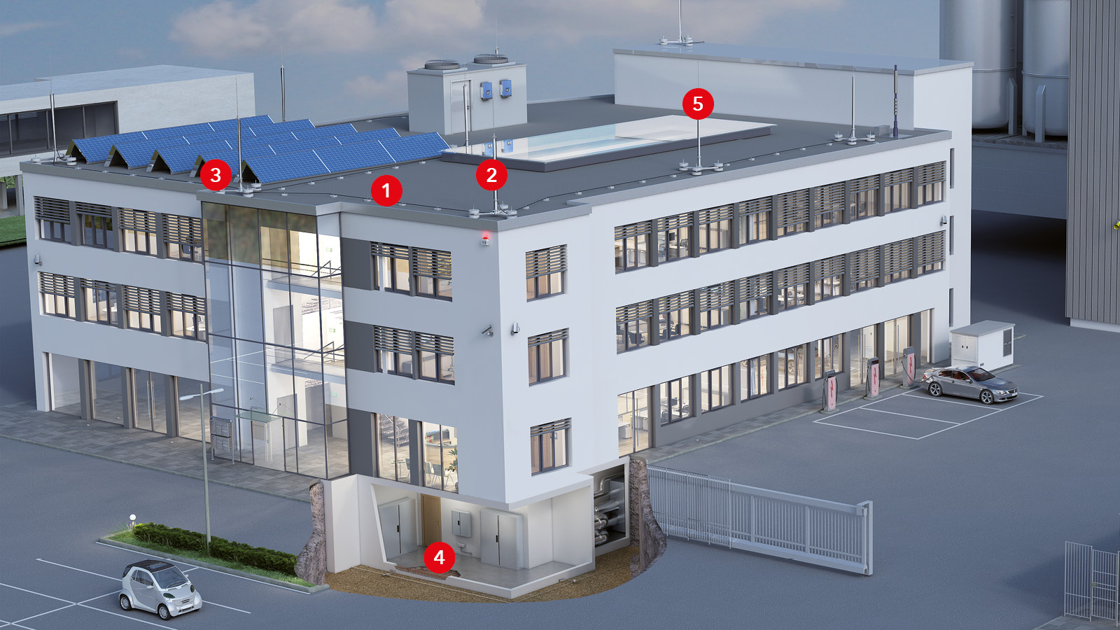 Durch große Flächen und komplexe Gebäudestrukturen ist ein äußeres Blitzschutzsystem bei Industrie- und Gewerbebauten besonders wichtig. Der äußere Blitzschutz sichert Gebäude und schützt PV-Module vor den Folgen eines direkten Blitzeinschlags. Die notwendigen Maßnahmen zur Umsetzung sind in der ÖVE/ÖNORM EN 62305-3 geregelt.
