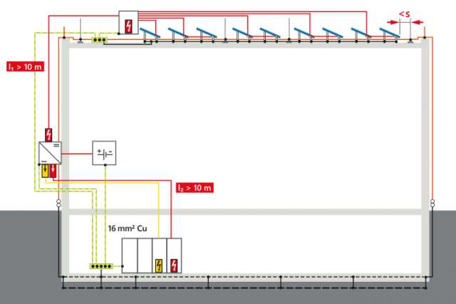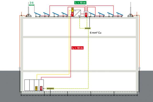 Die PV-Module müssen im Schutzbereich der getrennten Fangeinrichtung angeordnet sein – unter Einhaltung des Trennungsabstandes „s“. Prinzipiell sollte ein Blitzschutzsystem bevorzugt werden, das unter Berücksichtigung der erforderlichen Trennungsabstände keine direkte Verbindung zum PV-Stromversorgungssystem aufweist.