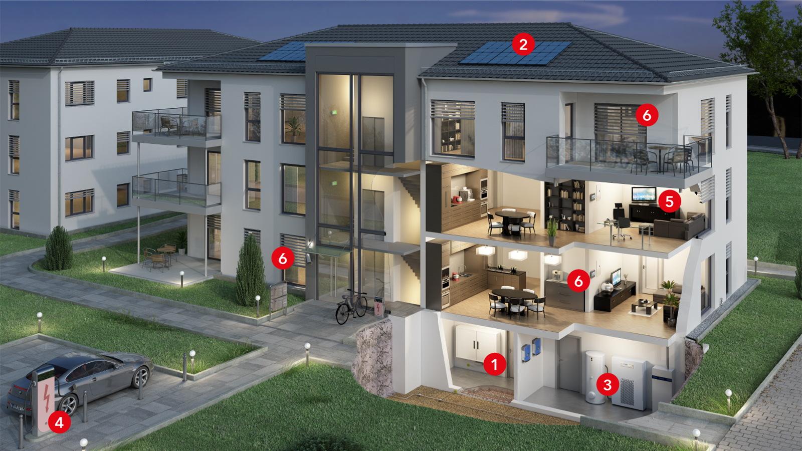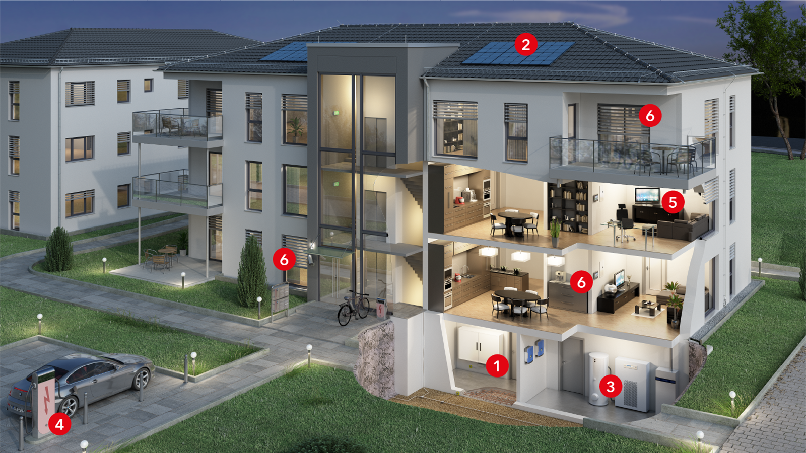 1: Hausanschluss / Zählerschrank2: Photovoltaikanlage (DC-Seite)3: Wärmepumpe / Klima- und Lüftungsgeräte4: E-Mobility5: SAT und TV6: Smart Home / KNX / Endgeräte6: Smart Home / KNX / Endgeräte6: Smart Home / KNX / Endgeräte1: Hausanschluss / Zählerschrank2: Photovoltaikanlage (DC-Seite)3: Wärmepumpe / Klima- und Lüftungsgeräte4: E-Mobility5: SAT und TV6: Smart Home / KNX / Endgeräte6: Smart Home / KNX / Endgeräte6: Smart Home / KNX / Endgeräte