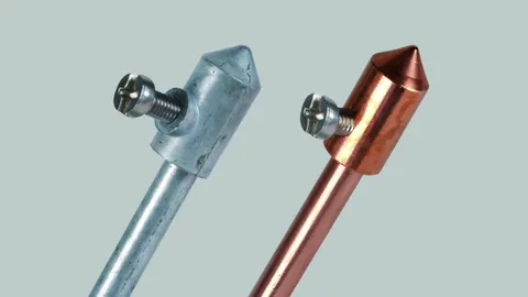 Air-termination rods, air-termination tips, telescopic lightning protection masts and accessories for protecting elevated roof-mounted structures or buildings.