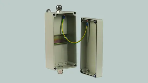 Lightning-current-tested shield terminals with accessories for lightning equipotential bonding of cable shields and aluminium enclosures for DIN rail mounted devices.