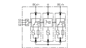 Modular multipole surge arrester with three-step d.c. switching device for protecting 3 MPP inputs; for PV systems with remote signalling contact for monitoring device (floating changeover contact).