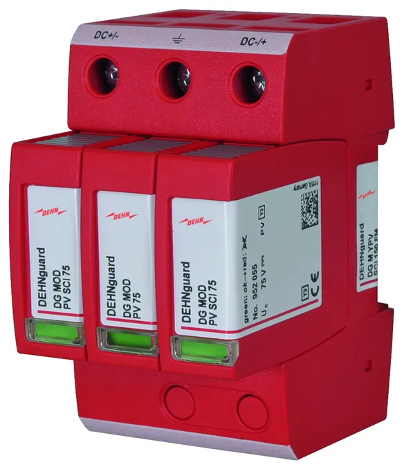 The patented SCI technology with active arc extinction allows to actively, quickly and safely extinguish a possible switching arc in case of overload. The PV fuse integrated in the short-circuit path trips immediately after the arc has been extinguished, thus ensuring safe electrical isolation (interruption). Consequently, all PV arresters from DEHN combine surge protection, fire protection and personal protection in a single device