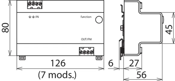 - Visual operating state indication (green) and floating remote signalling contact (break contact) for fault indication