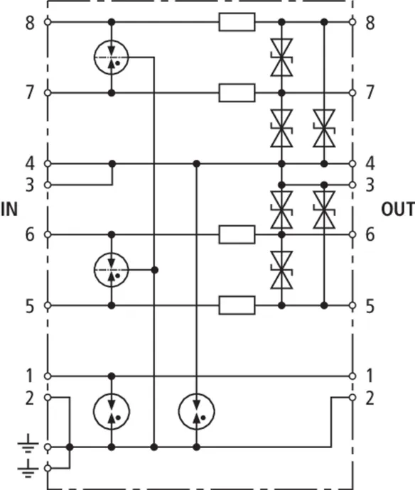 Energy-coordinated and leakage-current-free surge arrester for a/b lines, ISDN Uk0 or ADSL with RJ45 connections and additional screw terminals. Pinning of the RJ45 sockets is compatible with RJ11/12. The parallel screw terminals are more robust than the RJ45 sockets and increase the total nominal discharge current to 10 kA.