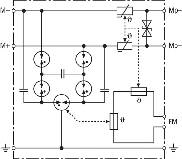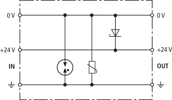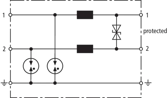 Energy coordinated combined arrester for protecting the rectifier in the protective circuit (red colour). Pluggable remote signalling contact (break contact) for overload indication (temperature monitoring of the varistors). Installation in sheet metal housing recommended. Low impulse sparkover voltage due to capacitive control.