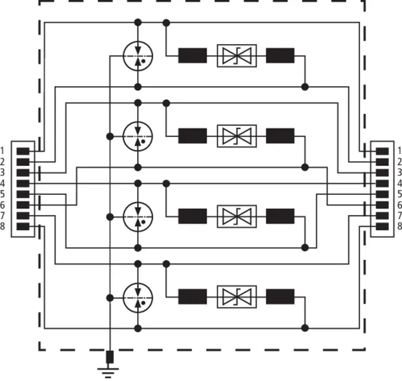 Universal, space-saving lightning current arrester of 19 mm in width and RJ45 connection system for lightning equipotential bonding. Protection of applications in structured cabling according to class S to 100 MHz; e.g. industrial Ethernet, data distributors, digital camera systems, Power over Ethernet (IEEE 802.3 compliant to 4PPoE) and Ethernet-based interfaces in general. Protection of all pairs through powerful gas discharge tubes. Fully shielded adapter design with RJ45 sockets for DIN rail mounting. With additional screw connection on the enclosure for an optional earth connection.