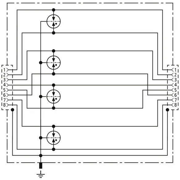 Universal, space-saving combined arrester of 19 mm in width and RJ45 connection system with status indication for simple maintenance. Protection of applications in structured cabling according to class EA to 500 MHz; e.g. industrial Ethernet, data distributors, digital camera systems, Power over Ethernet (IEEE 802.3 compliant to 4PPoE) and Ethernet-based interfaces in general. Protection of all pairs through powerful gas discharge tubes and protective diodes between signal cores and pairs. Fully shielded adapter design with RJ45 sockets for DIN rail mounting. With additional screw connection on the enclosure for an optional earth connection.