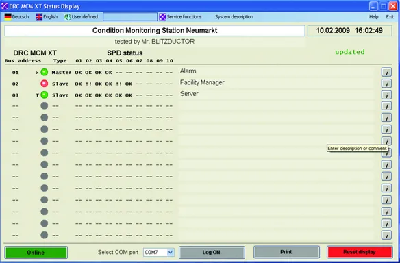 Up to 15 DRC MCM XT can be monitored via the integrated RS485 interface in a system with up to 150 BLITZDUCTOR XT/XTU arresters. The free "Status Display and Service Console" software can be optionally used via an RS485 interface converter. The software allows PC-based remote indication of the condition of all monitored arresters.