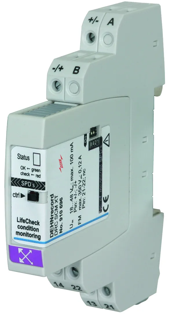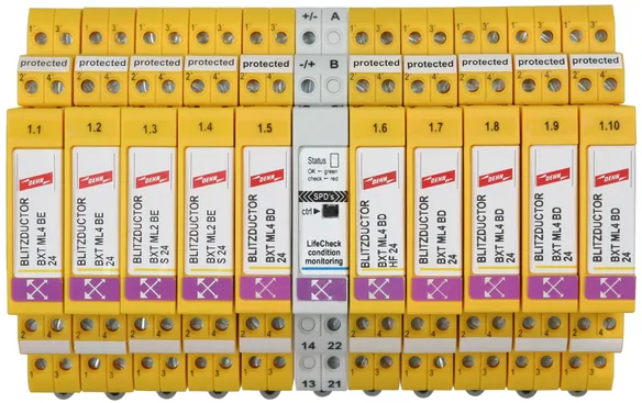 DIN rail mounted device with integrated RFID LifeCheck sensor for condition monitoring of max. 10 BLITZDUCTOR XT / XTU arresters with RFID LifeCheck technology. Visual operating state indication via three-coloured LED in conjunction with remote signalling contact (break or make contact).