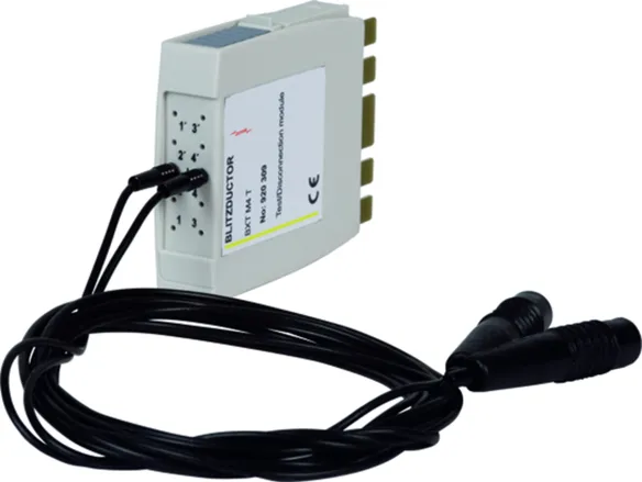 The plugged-in test / disconnection module interrupts the cable run of the lines connected to the BLITZDUCTOR SP / XT / XTU base part and leads them to a test socket at the front of the module. This allows to carry out measurements in the installation without removing the lines from the base part.