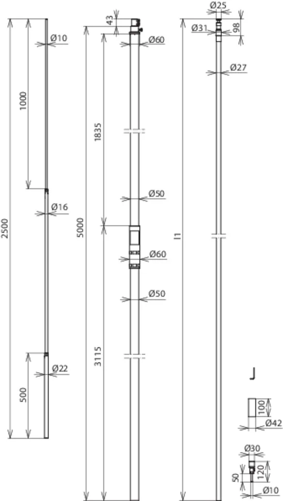 Max. free length with air-termination rod (wall mounting): 5000 mm