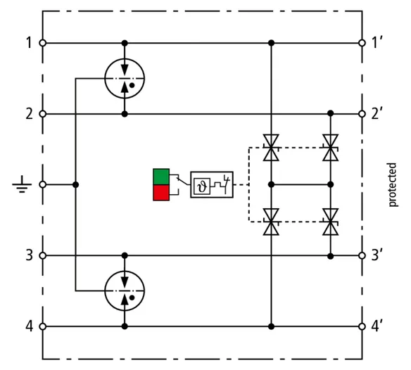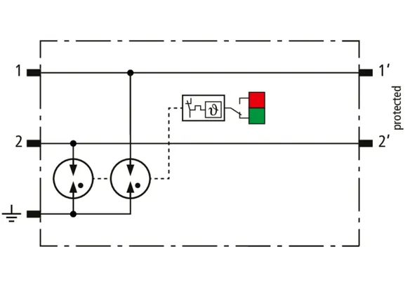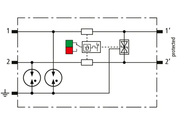 Space-saving, compact surge arrester with a width of 6 mm and push-in connection technology with status indication. Finely limiting, single-stage surge protection with powerful diodes for protecting two single cores sharing a common reference potential as well as unbalanced interfaces.