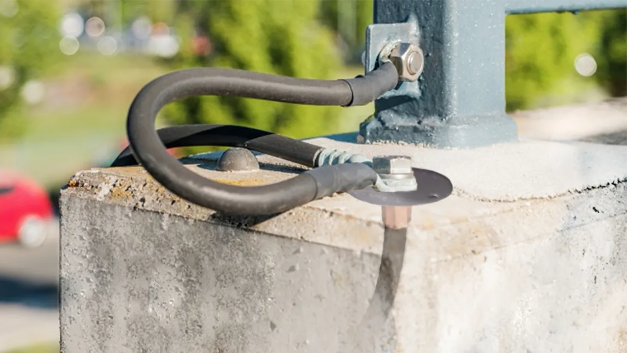 The earthing bridges are designed for earthing, current return circuits and equipotential bonding in railway line applications. This version is installed flush with the surface and welded to the earthing reinforcement with the angled reinforcing steel, particularly in installation situations where space is critical. This earthing bridge also has a technical approval from DB Netz AG and can therefore be reliably used in planning.