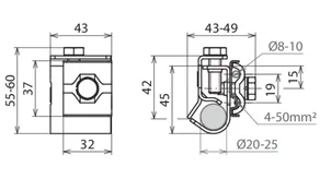 1 conductor Rd Ø10 mm or 1-2 conductors Rd Ø6-8 mm or 4-50 mm2 (solid / stranded).