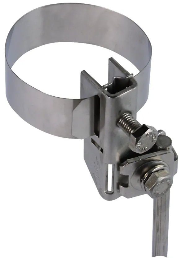 Pipe clamp for lightning equipotential bonding of pipes (e.g. antenna poles) according to IEC/EN 62305-3.