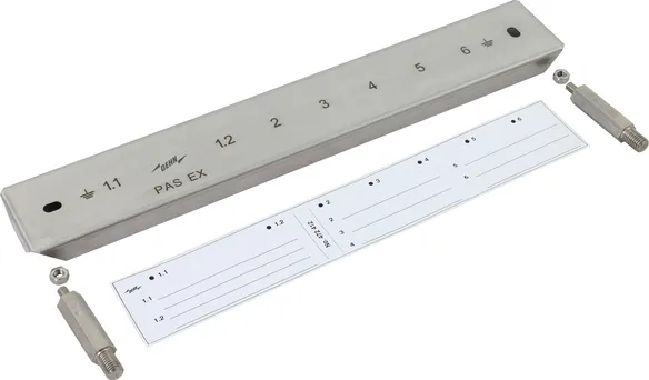Adapter for non-sparking Ex equipotential bonding bar PAS EX for connecting a flat conductor. For use in potentially explosive areas of Ex zones 1 and 2 (gases, vapours, mists) up to explosion group IIC as well as Ex zones 21 and 22 (dusts). Both indoor and outdoor installation permissible.