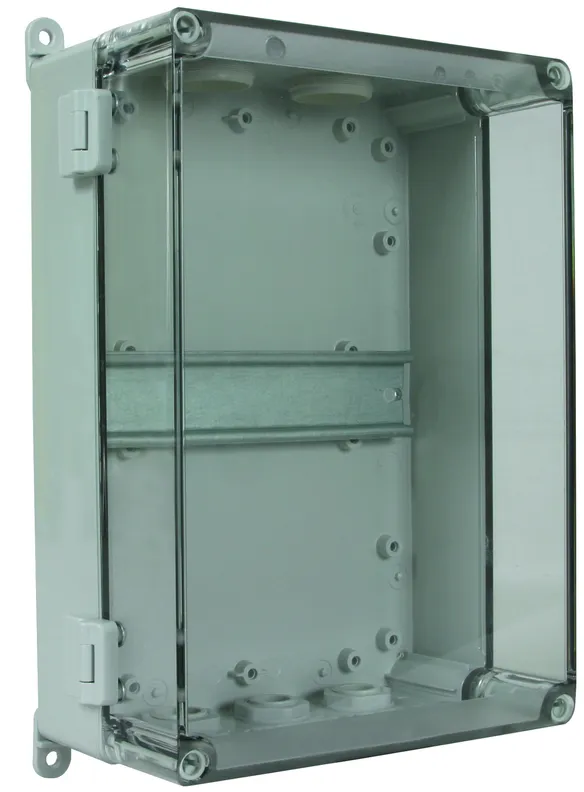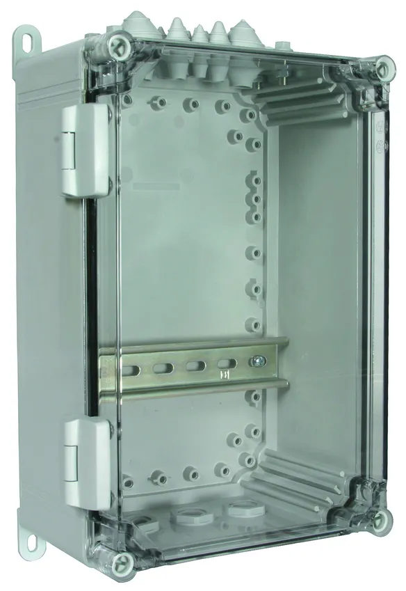 Lightning-current-tested insulating enclosure with a max. capacity of ten modules; with grommet flange for 11 EPDM cables (Ø5-30 mm) and three mounted M20 grommet openings with lock nut; ideally suited for series connection.