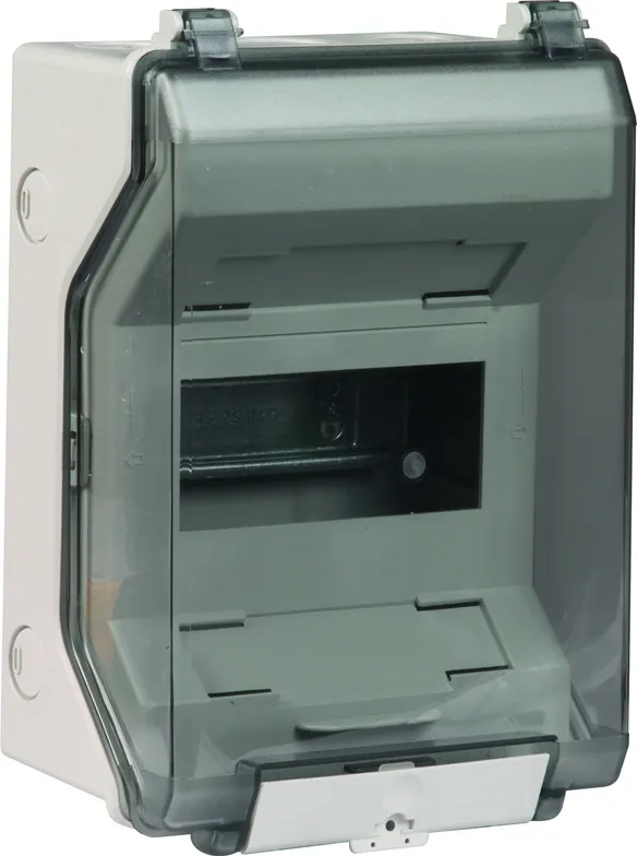 Lightning-current-tested insulating enclosure with a max. capacity of six modules for non-exhausting arresters; with knockouts for entering the cables and plug-in glands; ideally suited for series connection.