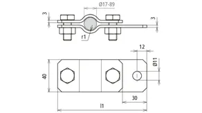 Connection for flat conductor with screws and nuts, for round steel 7–10 mm, e.g. KS connector part no. 301 000 or clamping piece part no. 390 150.