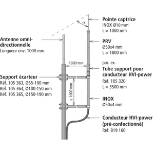 Lors de l’installation de dispositifs de capture isolés sur les antennes omnidirectionnelles, on veillera à ce qu’une pointe captrice isolée couvre l’antenne à protéger sous un angle de protection suffisant. De plus on veillera à ce qu'une distance de séparation s suffisante soit respectée.